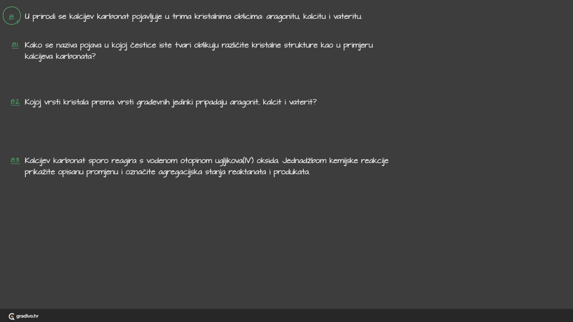 Kalcijev karbonat sporo reagira s vodenom otopinom ugljikova(IV) oksida. Jednadžbom kemijske reakcije prikažite opisanu promjenu i označite agregacijska stanja reaktanata i produkata.