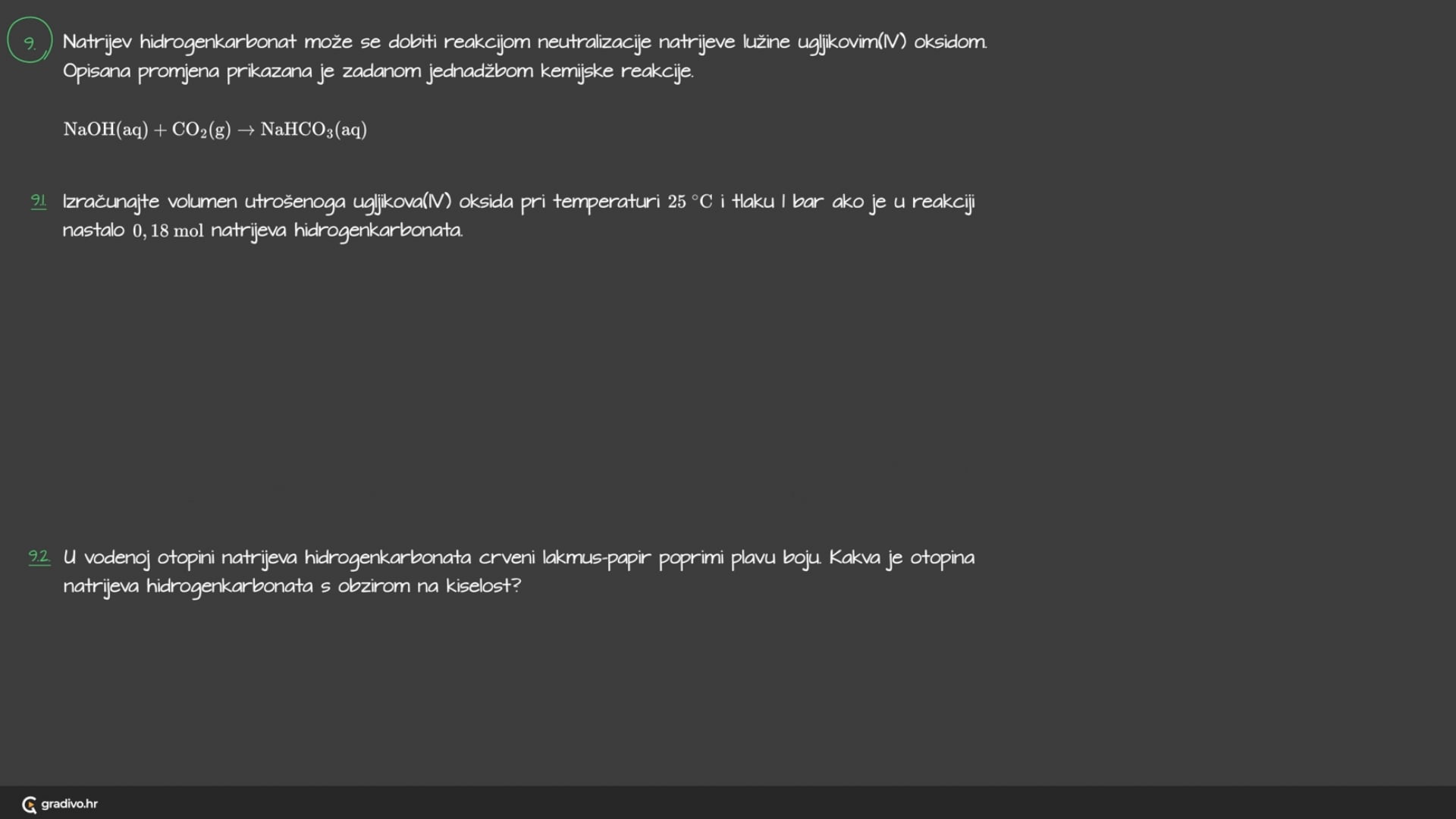 Izračunajte volumen utrošenoga ugljikova(IV) oksida pri temperaturi 25∘C i tlaku 1 bar ako je u reakciji nastalo 0,18mol natrijeva hidrogenkarbonata.