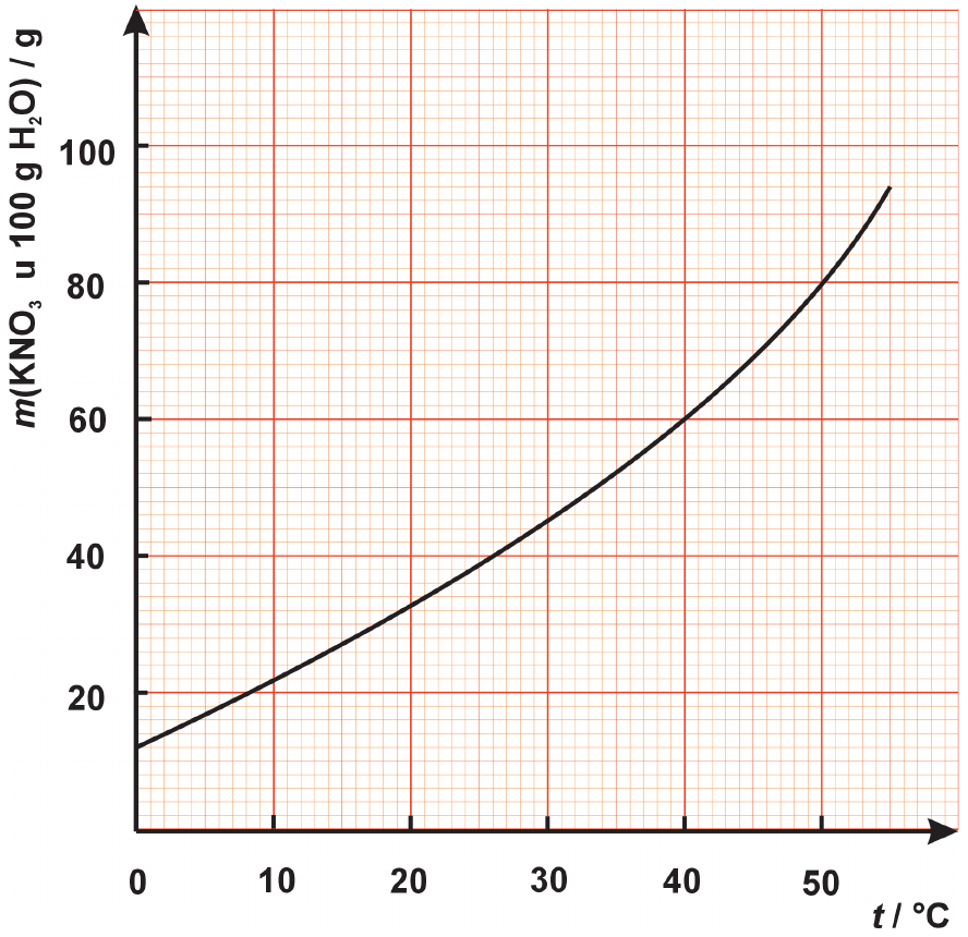 Graf prikazuje topljivost kalijeva nitrata u vodi.