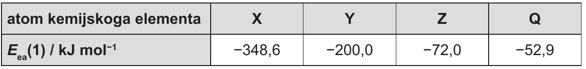 U tablici su navedene vrijednosti energija prvoga elektronskog afiniteta atoma četiriju kemijskih elemenata iste periode označenih slovima \(\mathbf{X}, \mathbf{Y}, \mathbf{Z}\) i \(\mathbf{Q}\).