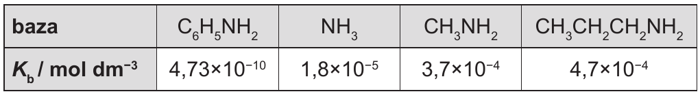 U tablici su navedene vrijednosti konstanta ravnoteže ionizacija četiriju baza pri \(25^{\circ} \mathrm{C}\).