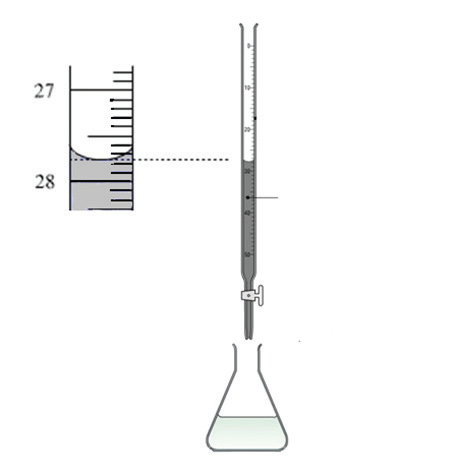 Vodena otopina natrijeva tiosulfata (\(\mathrm{Na}_{2} \mathrm{~S}_{2} \mathrm{O}_{3}\)) korištena je za standardizaciju pripremljene otopine kalijeva permanganata. Očitajte volumen vodene otopine natrijeva tiosulfata u bireti.