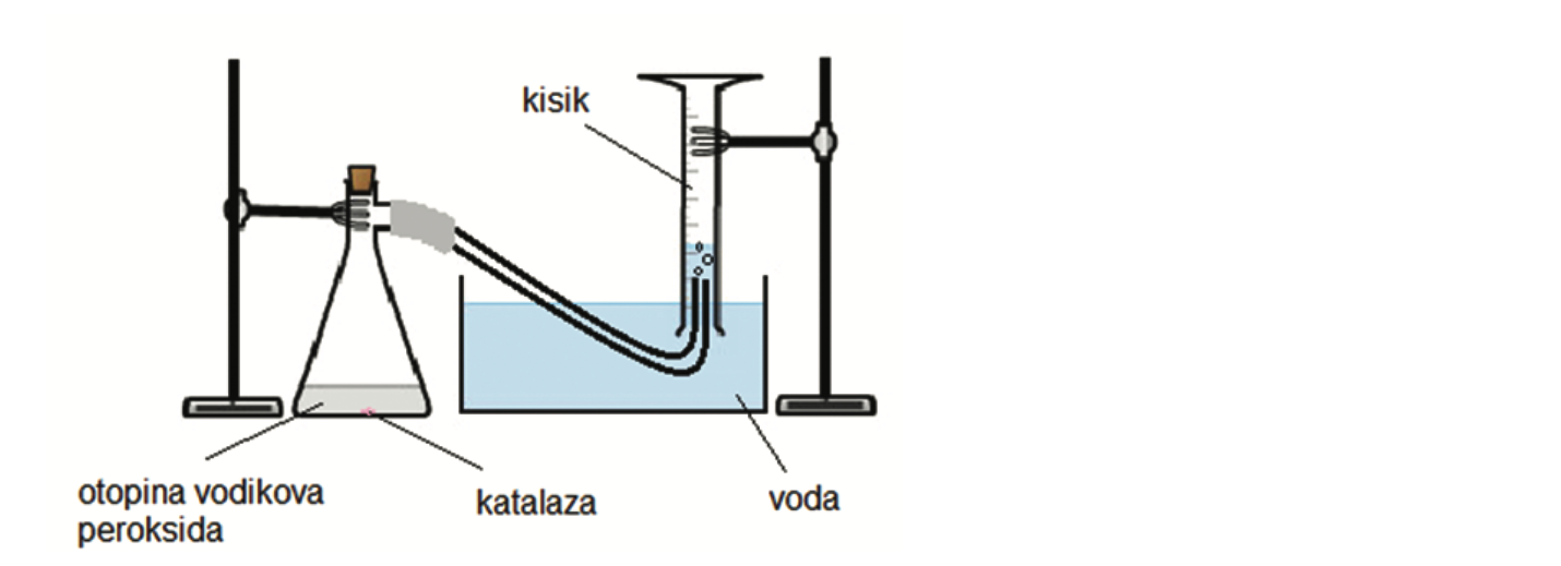 3. Vodikov je peroksid nestabilan i na sobnoj temperaturi se polagano raspada. Raspad se može ubrzati ako se doda enzim katalaza. Pri raspadu se oslobađa kisik koji se skuplja u menzuri. Opisani pokus prikazan je na slici.