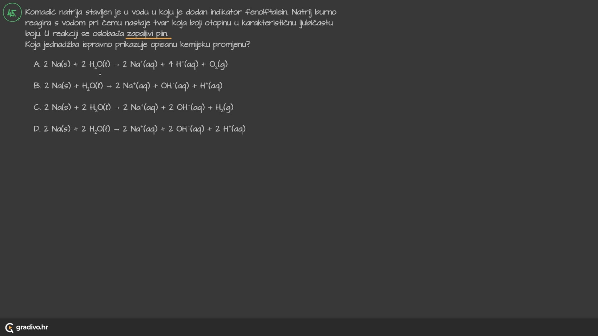 Komadić natrija stavljen je u vodu u koju je dodan indikator fenolftalein. Natrij burno reaguje s vodom pri čemu nastaje tvar koja boji otopinu u karakterističnu ljubičastu boju. U reakciji se oslobađa zapaljivi plin. Koja jednadžba ispravno prikazuje opisanu kemijsku promjenu?