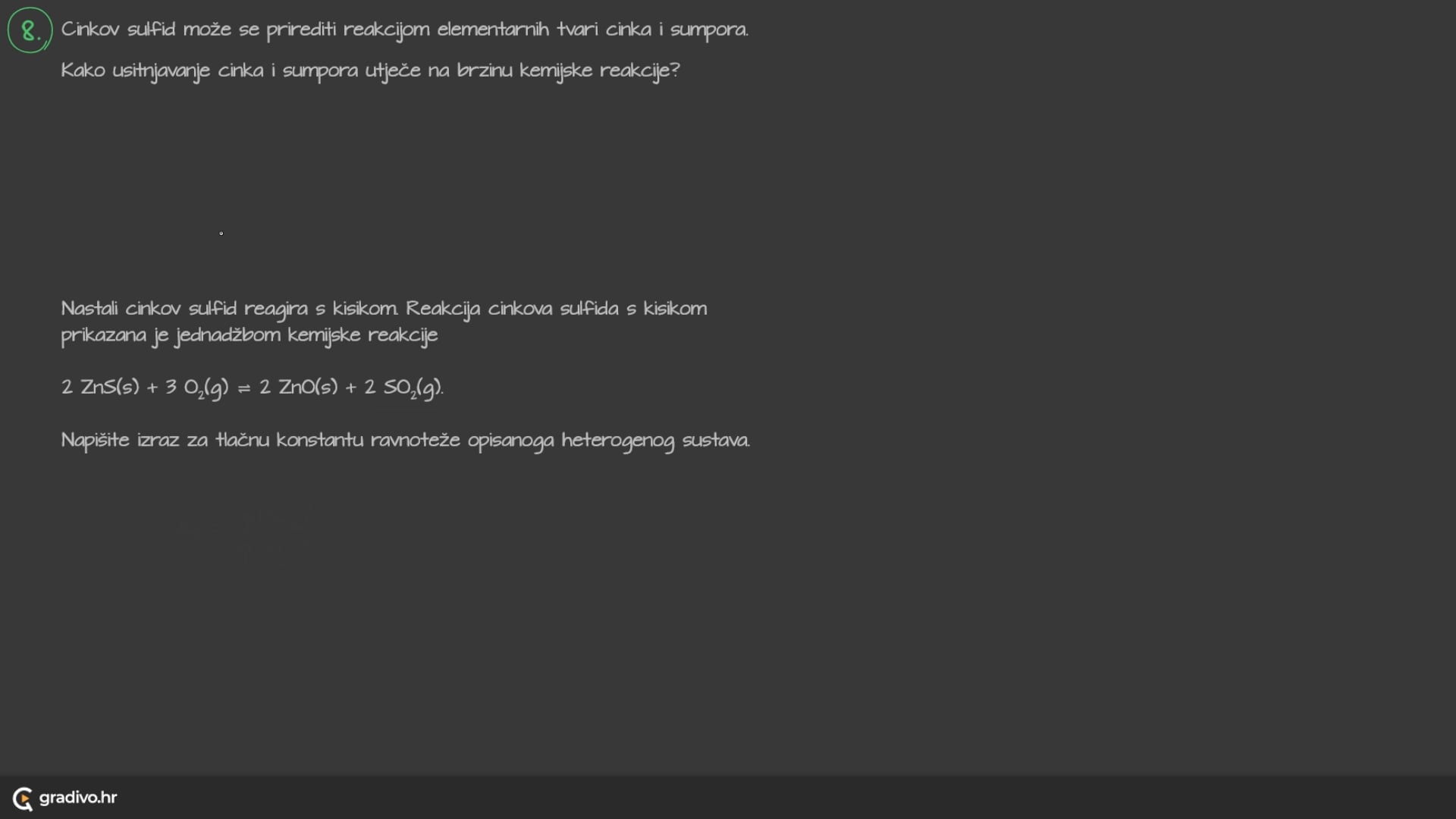 Nastali cinkov sulfid reagira s kisikom. Reakcija cinkova sulfida s kisikom prikazana je jednadžbom kemijske reakcije 2ZnS(s)+3O2(g)⇌2ZnO(s)+2SO2(g) .