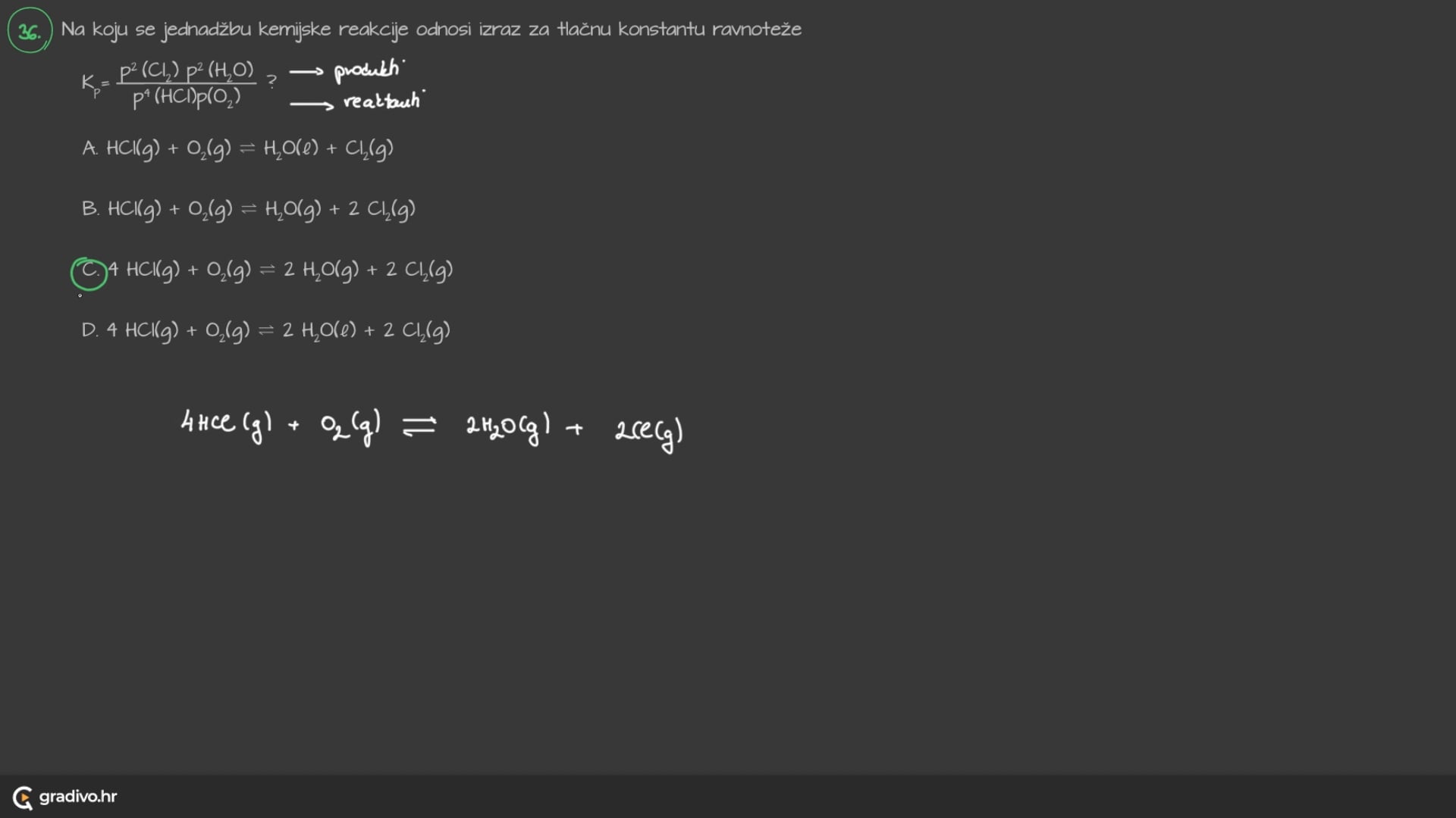 Na koju se jednadžbu kemijske reakcije odnosi izraz za tlačnu konstantu ravnoteže \(K_{p}=\frac{p^{2}\left(\mathrm{Cl}_{2}\right) p^{2}\left(\mathrm{H}_{2} \mathrm{O}\right)}{p^{4}(\mathrm{HCl}) p\left(\mathrm{O}_{2}\right)} \)?