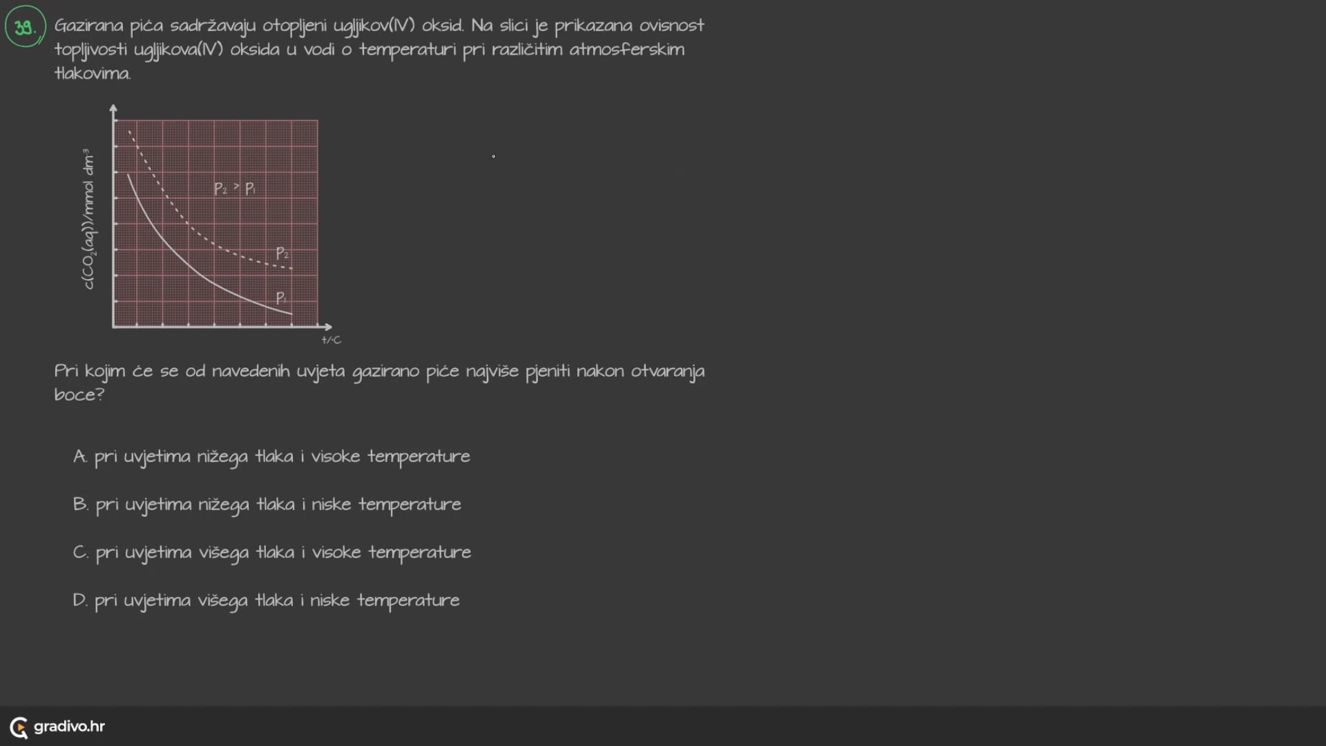 Gazirana pića sadržavaju otopljeni uglijkov(IV) oksid. Na slici je prikazana ovisnost topljivosti ugljikova(IV) oksida u vodi o temperaturi pri različitim atmosferskim tlakovima.