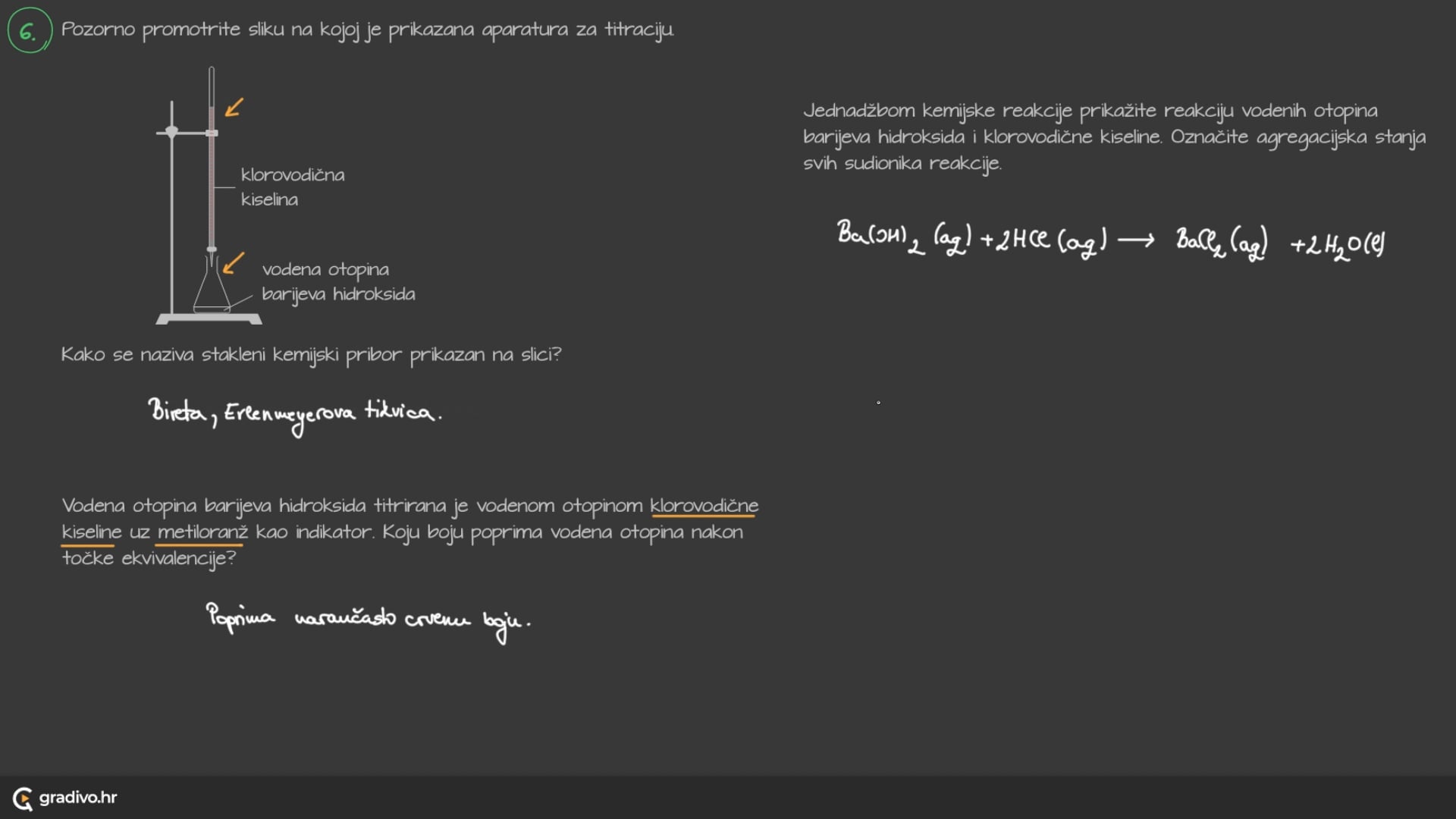 Jednadžbom kemijske reakcije prikažite reakciju vodenih otopina barijeva hidroksida i klorovodične kiseline. Označite agregacijska stanja svih sudionika reakcije.