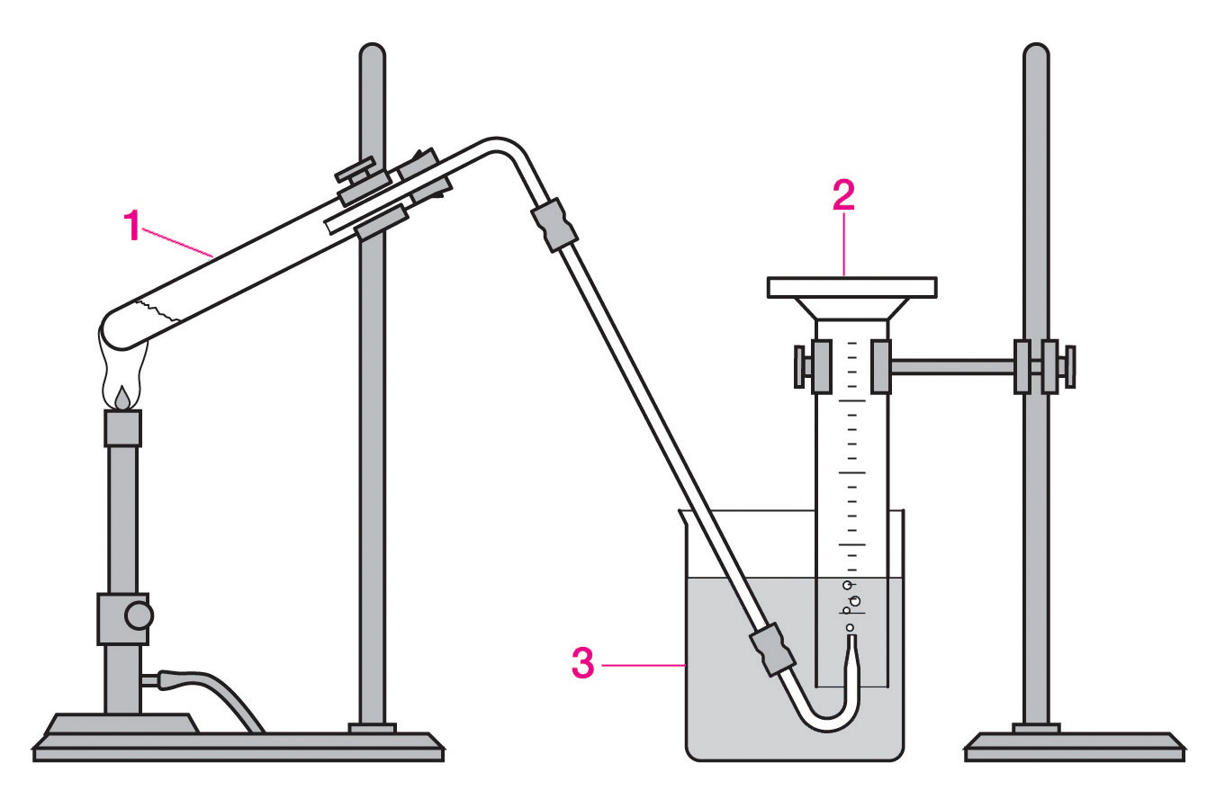 Imenujte stakleni kemijski pribor označen brojevima na slici, a upotrebljava se pri termičkoj razgradnji kalijeva klorata.