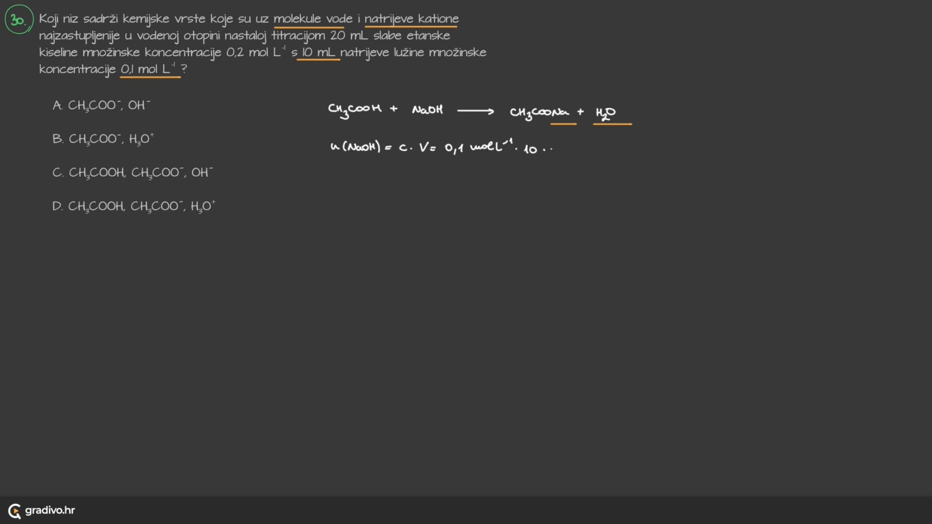 Koji niz sadrži kemijske vrste koje su uz molekule vode i natrijeve katione najzastupljenije u vodenoj otopini nastaloj titracijom 20 mL slabe etanske kiseline množinske koncentracije \(0,2 \mathrm{~mol} \mathrm{~L}^{-1}\) s 10 mL natrijeve lužine množinske koncentracije \(0,1 \mathrm{~mol} \mathrm{~L}^{-1}\) ?