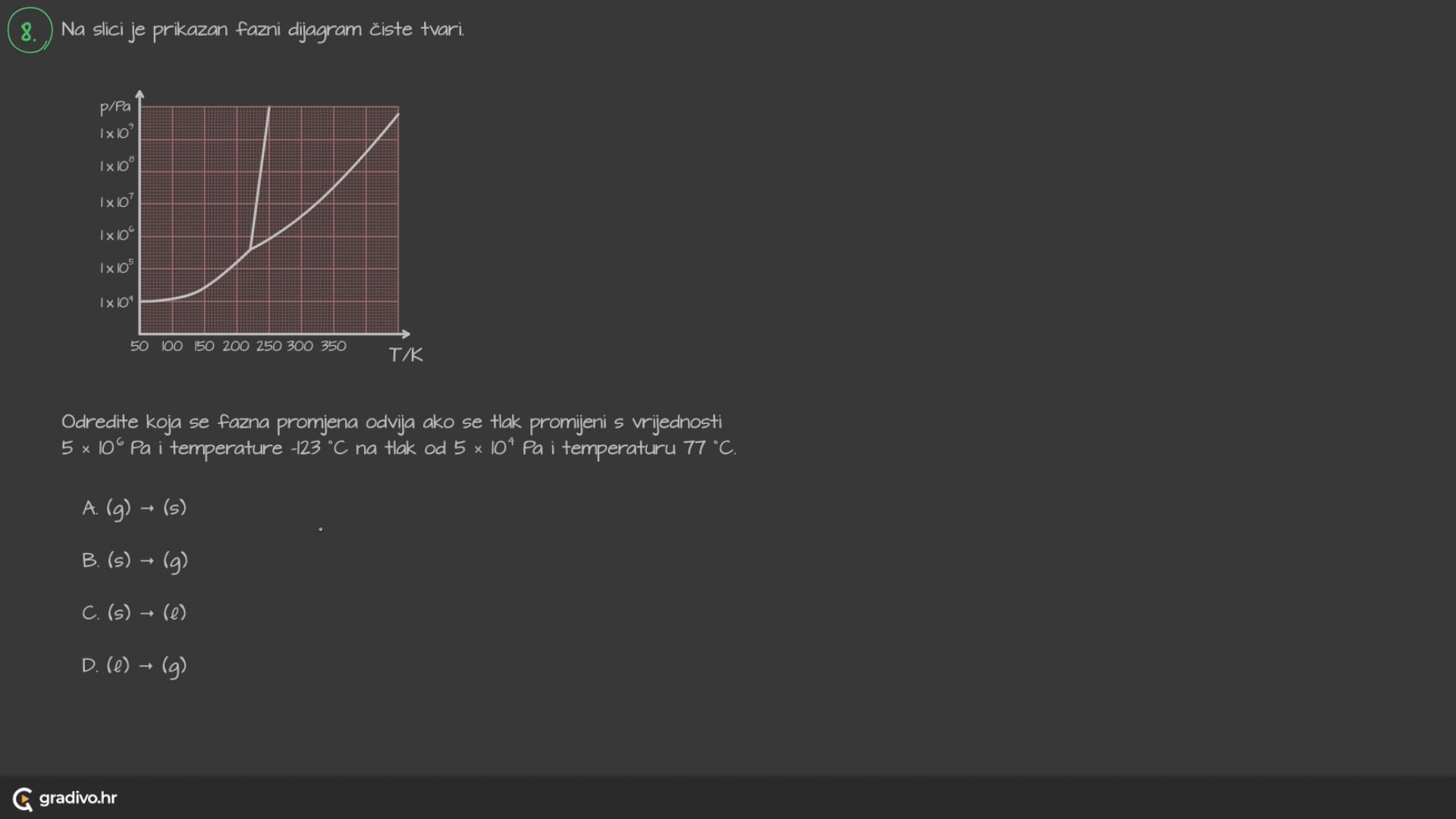 Odredite koja se fazna promjena odvija ako se tlak promijeni s vrijednosti \(5 \times 10^{6} \mathrm{~Pa}\) i temperature −123 °C na tlak od \(5 \times 10^{4} \mathrm{~Pa}\) i temperaturu 77 °C.