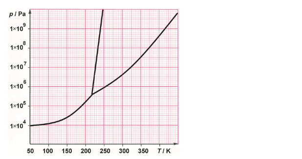 Odredite koja se fazna promjena odvija ako se tlak promijeni s vrijednosti \(5 \times 10^{6} \mathrm{~Pa}\) i temperature −123 °C na tlak od \(5 \times 10^{4} \mathrm{~Pa}\) i temperaturu 77 °C.