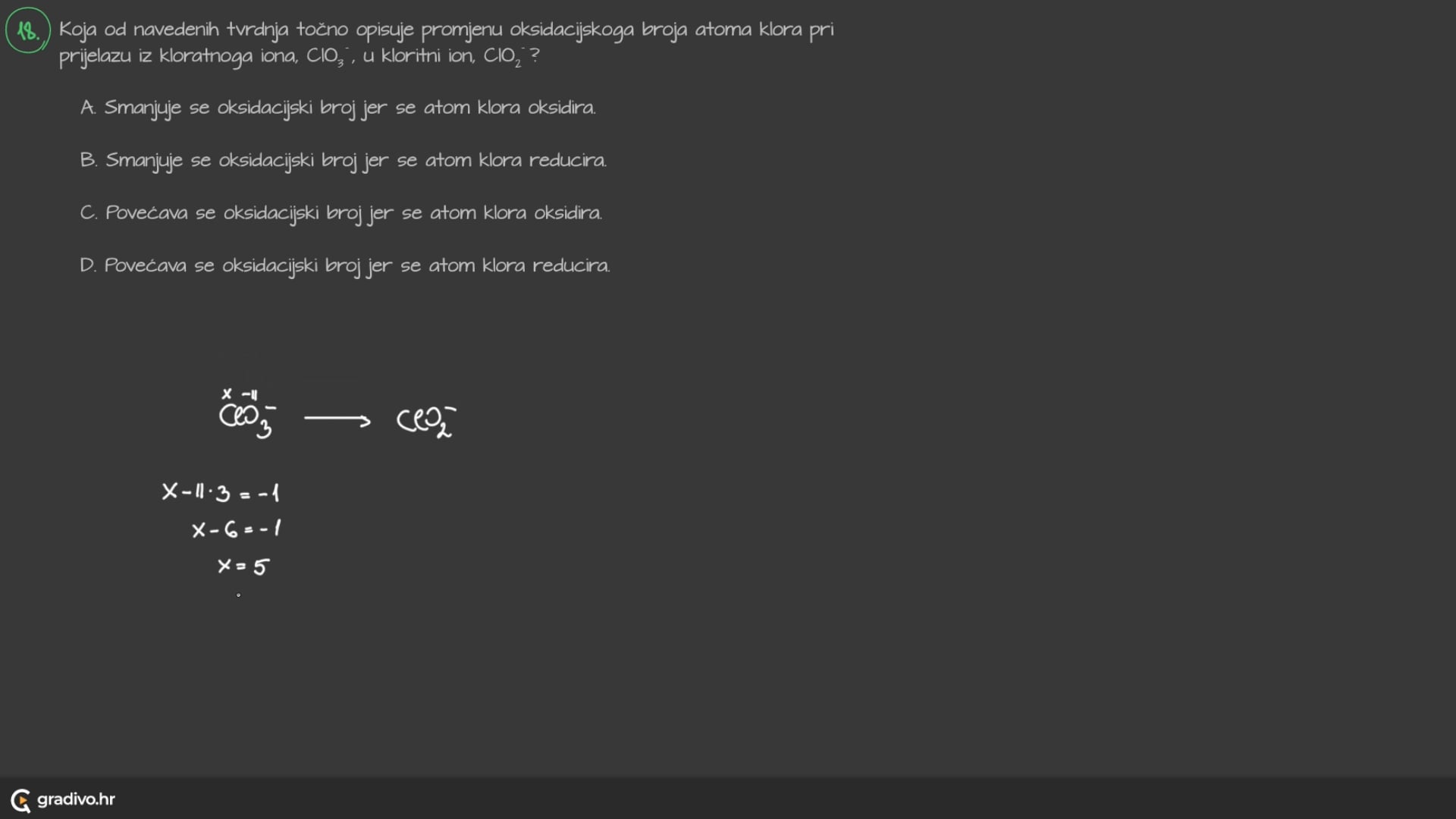 A. Smanjuje se oksidacijski broj jer se atom klora oksidira.