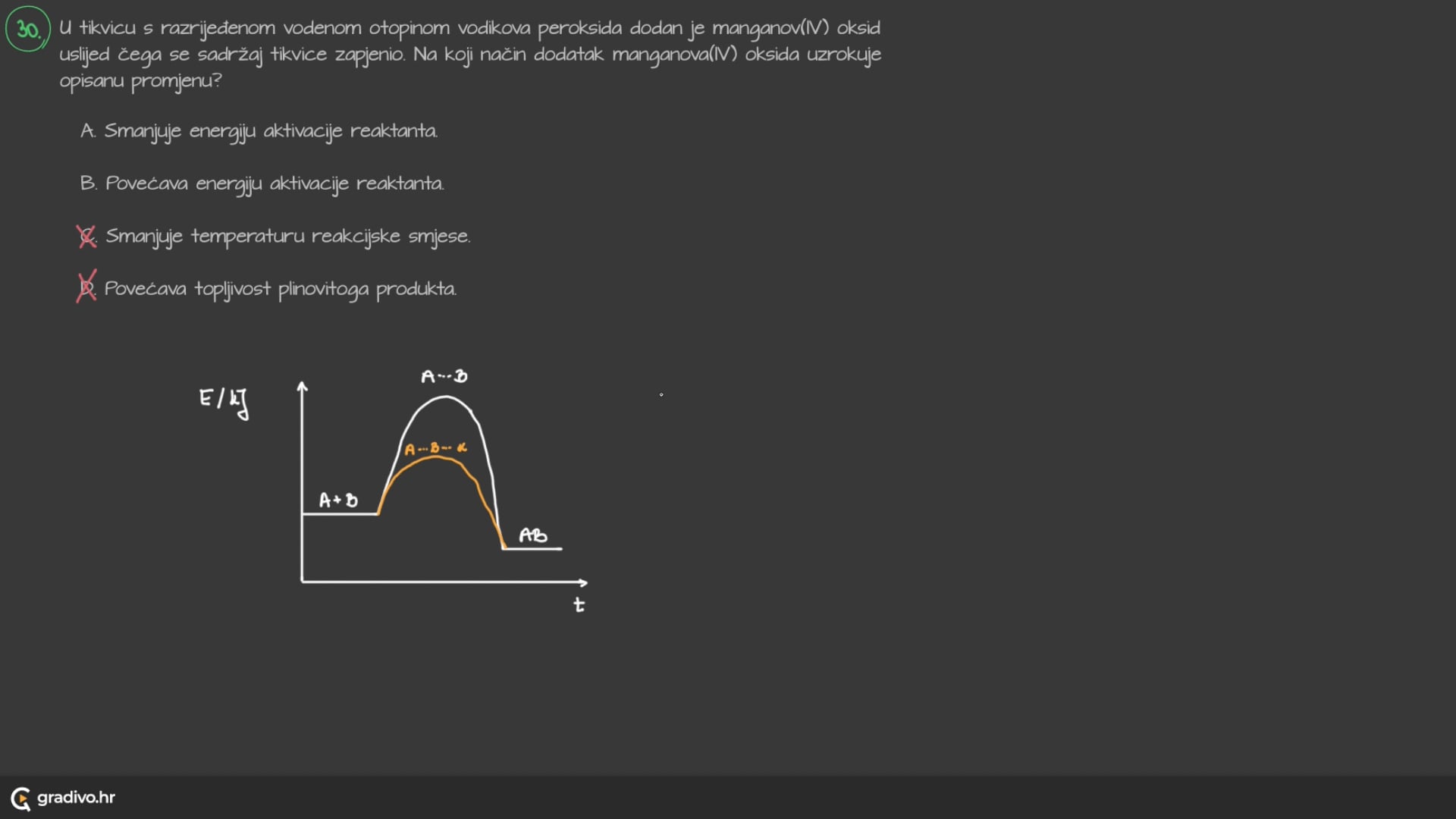 U tikvicu s razrijeđenom vodenom otopinom vodikova peroksida dodan je manganov(IV) oksid uslijed čega se sadržaj tikvice zapjenio. Na koji način dodatak manganova(IV) oksida uzrokuje opisanu promjenu?