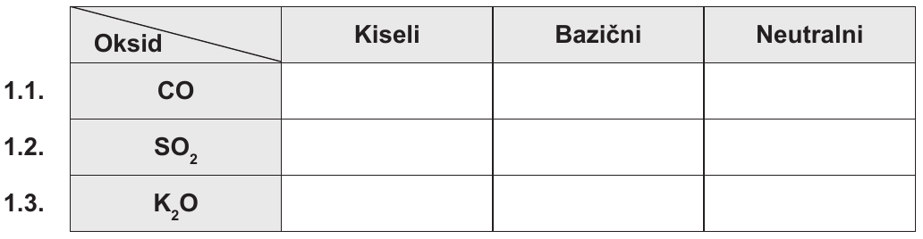Nabrojene okside razvrstajte na kisele, bazične i neutralne. Znakom $X$ obilježite kojoj vrsti pripada pojedini oksid.