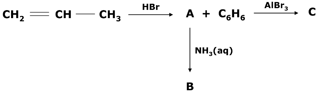 Organski spojevi A, B i C su produkti triju različitih kemijskih reakcija. Spoj A je i polazna tvar reakcija u kojima nastaju produkti BiC. Proučite prikazanu reakcijsku shemu te popunite sljedeću tablicu.