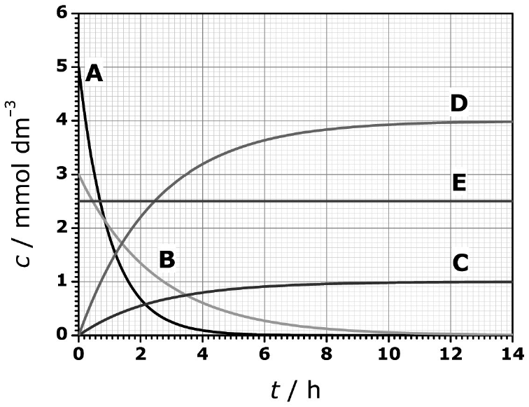 Na dijagramu je prikazana promjena množinske koncentracije pet tvari u reakcijskoj smjesi konstantnog volumena.
