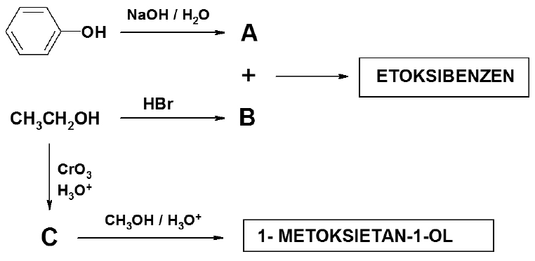 Oznake A, B i C prikazuju produkte kemijskih reakcija prikazanih sljedećom shemom. (Na strjelicama su navedeni preostali nužni reaktanti.)