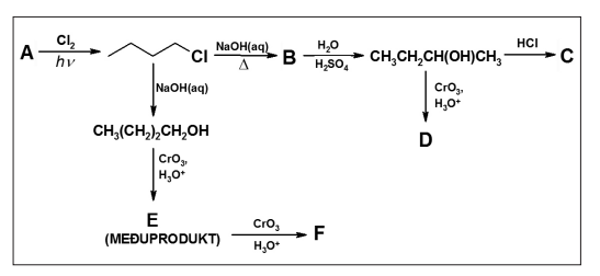 Napišite u tablicu kemijske formule reaktanata ili produkata A, B, C, D, E i F kemijskih reakcija prikazanih sljedećom shemom (preostali nužni reaktanti navedeni su na strelicama).