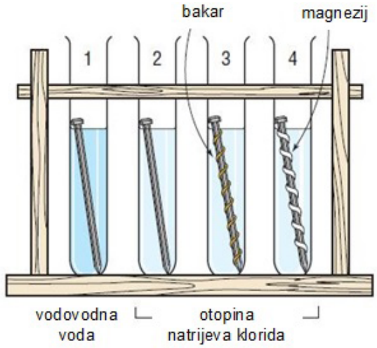 31. Na stalku se nalaze četiri epruvete označene brojevima. U epruvetu 1 ulivena je vodovodna voda, a u epruvete 2, 3 i 4 vodena otopina natrijeva klorida. U sve epruvete stavljen je željezni čavao. U epruveti 3 je oko željeznoga čavla omotana bakrena vrpca, a u epruveti 4 magnezijeva vrpca.