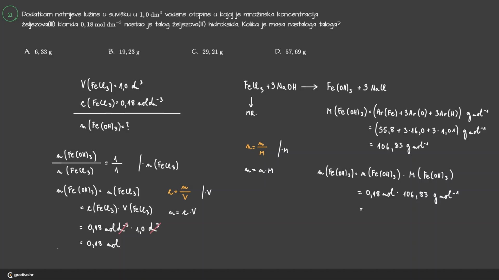 Dodatkom natrijeve lužine u suvišku u 1,0dm3 vodene otopine u kojoj je množinska koncentracija željezova(III) klorida 0,18moldm−3 nastao je talog željezova(III) hidroksida. Kolika je masa nastaloga taloga?