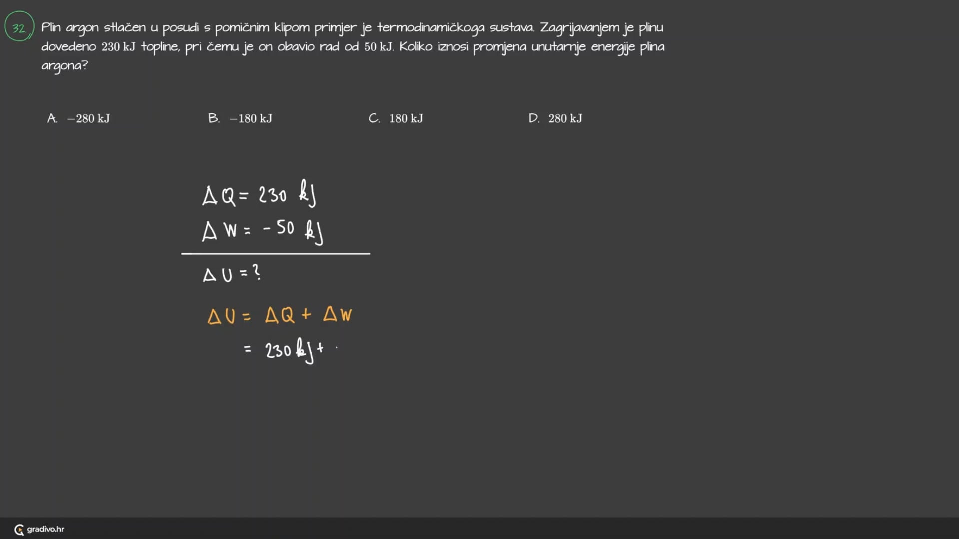 Plin argon stlačen u posudi s pomičnim klipom primjer je termodinamičkoga sustava. Zagrijavanjem je plinu dovedeno 230 kJ topline, pri čemu je on obavio rad od 50 kJ . Koliko iznosi promjena unutarnje energije plina argona?