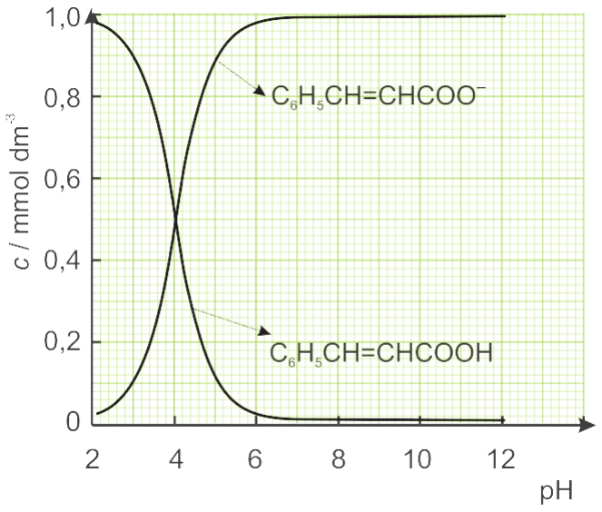 Na slici je prikazan dijagram ovisnosti množinske koncentracije nedisociranoga i disociranoga oblika cimetne kiseline (C6H5CH=CHCOOH) o pH-vrijednosti pri nekoj temperaturi.
