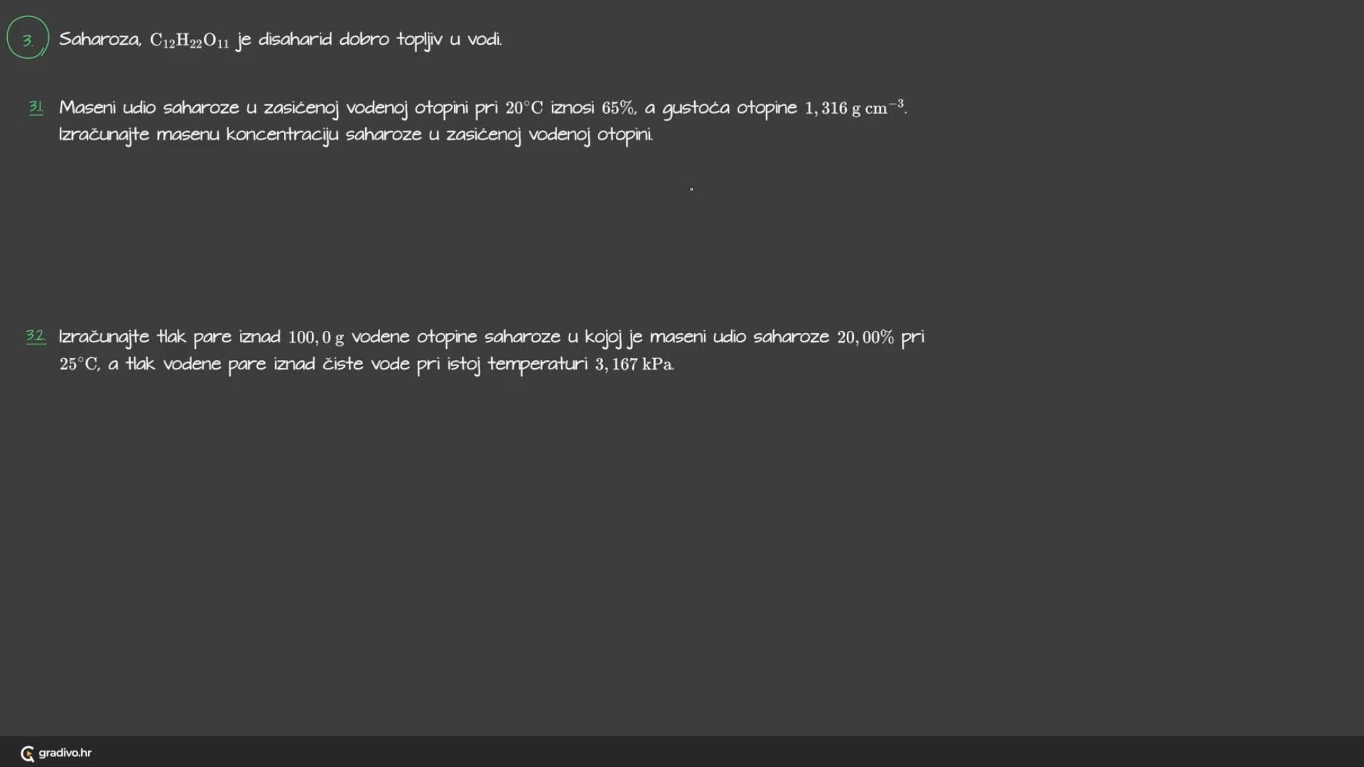 3.1. Maseni udio saharoze u zasićenoj vodenoj otopini pri 20∘C iznosi 65%, a gustoća otopine 1,316gcm−3. Izračunajte masenu koncentraciju saharoze u zasićenoj vodenoj otopini.