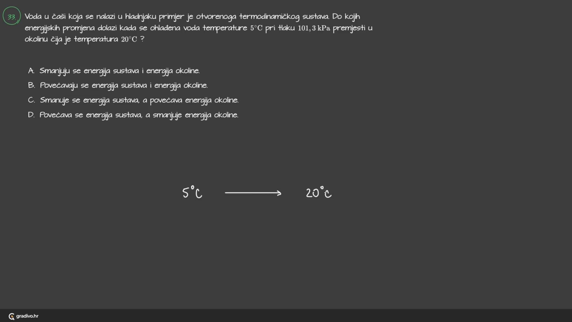 Voda u čaši koja se nalazi u hladnjaku primjer je otvorenoga termodinamičkog sustava. Do kojih energijskih promjena dolazi kada se ohlađena voda temperature 5∘C pri tlaku 101,3kPa premjesti u okolinu čija je temperatura 20∘C ?