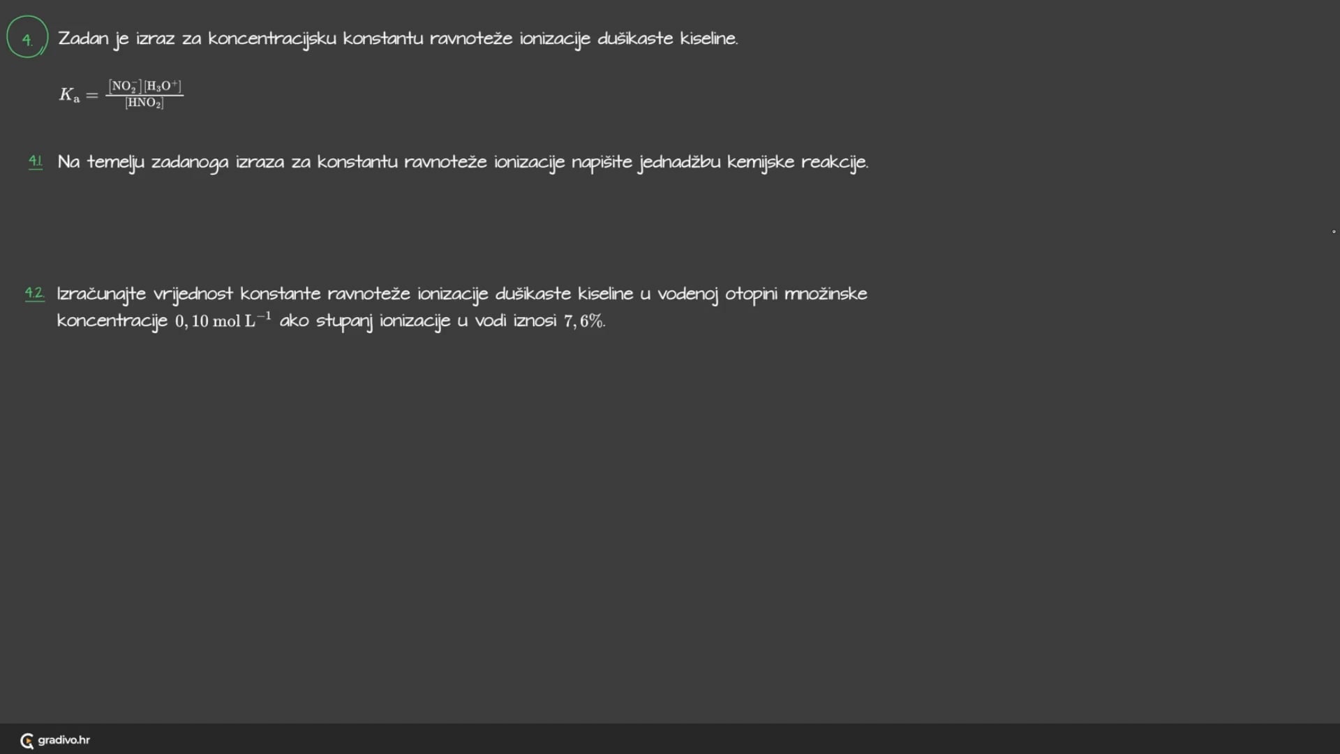 4.2. Izračunajte vrijednost konstante ravnoteže ionizacije dušikaste kiseline u vodenoj otopinimnožinske koncentracije 0,10molL−1 ako stupanj ionizacije u vodi iznosi 7,6%.