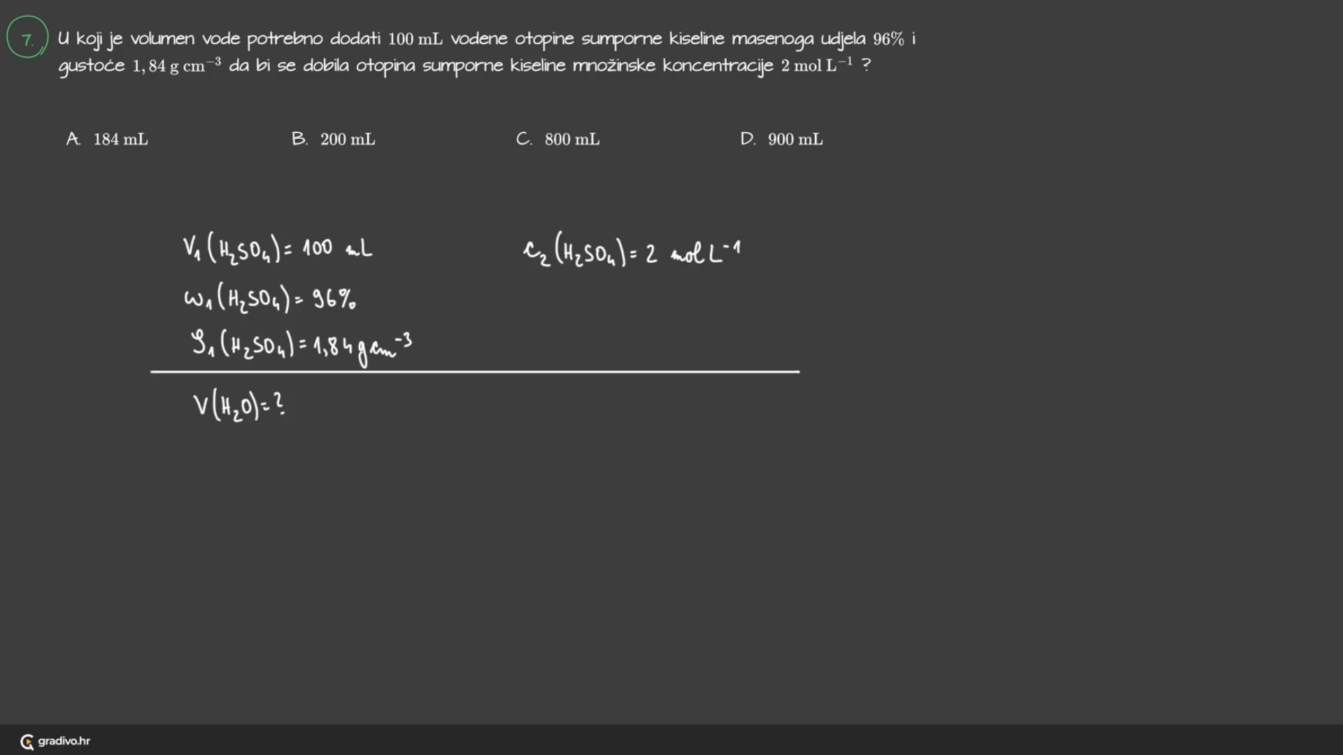 U koji je volumen vode potrebno dodati 100 mL vodene otopine sumporne kiseline masenoga udjela 96% i gustoće 1,84gcm−3 da bi se dobila otopina sumporne kiseline množinske koncentracije 2molL−1 ?