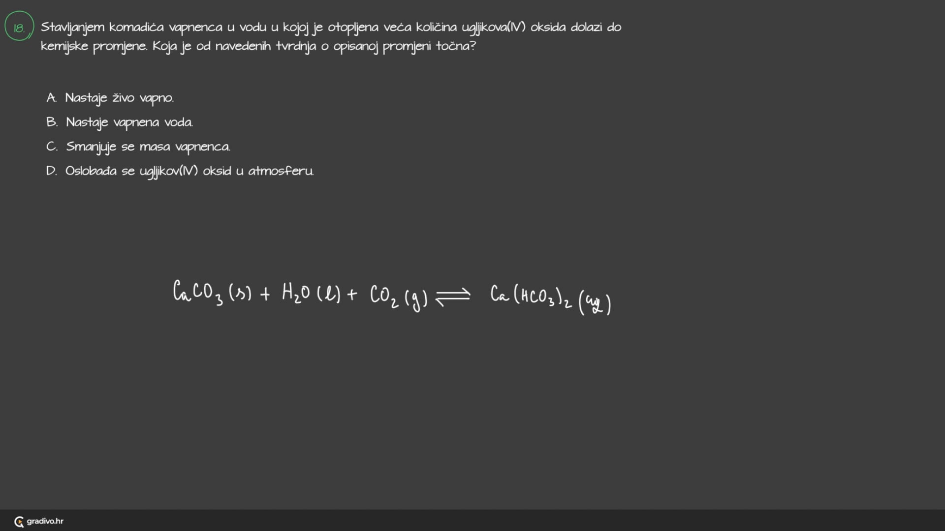 Stavljanjem komadića vapnenca u vodu u kojoj je otopljena veća količina ugljikova(IV) oksida dolazi do kemijske promjene. Koja je od navedenih tvrdnja o opisanoj promjeni točna?
