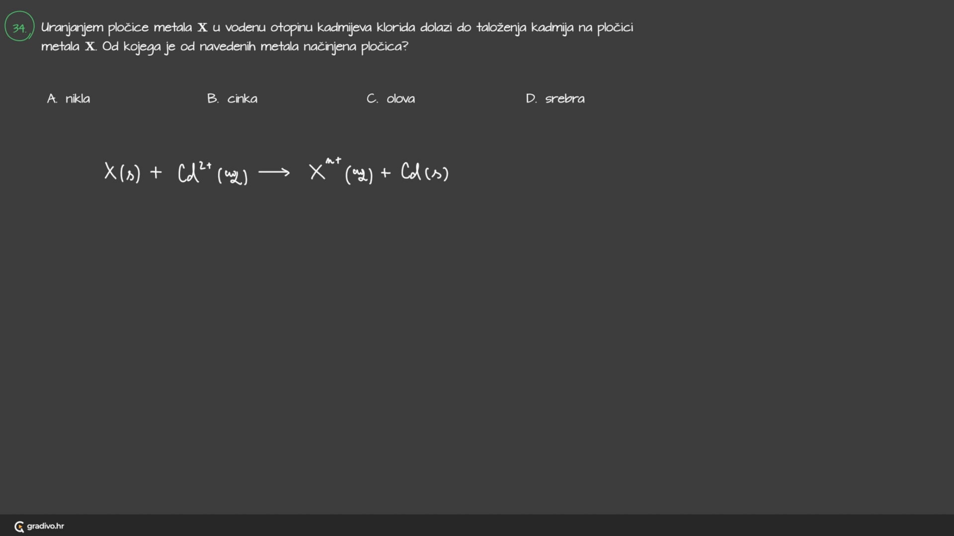 Uranjanjem pločice metala \(\mathbf{X}\) u vodenu otopinu kadmijeva klorida dolazi do taloženja kadmija na pločici metala \(\mathbf{X}\). Od kojega je od navedenih metala načinjena pločica?