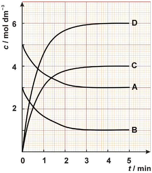 Dijagram prikazuje ovisnost množinske koncentracije sudionika kemijske reakcije o vremenu.