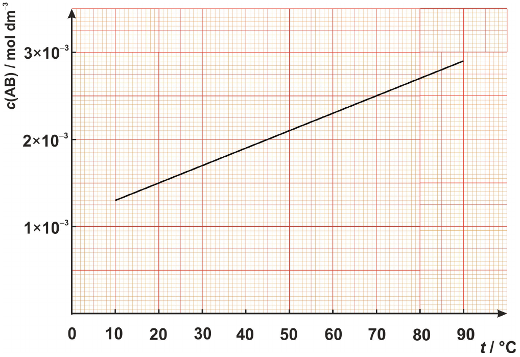 Graf prikazuje ovisnost množinske koncentracije soli tipa $\mathbf{A B}$, građene od dvovalentnih iona, u zasićenoj vodenoj otopini o temperaturi.