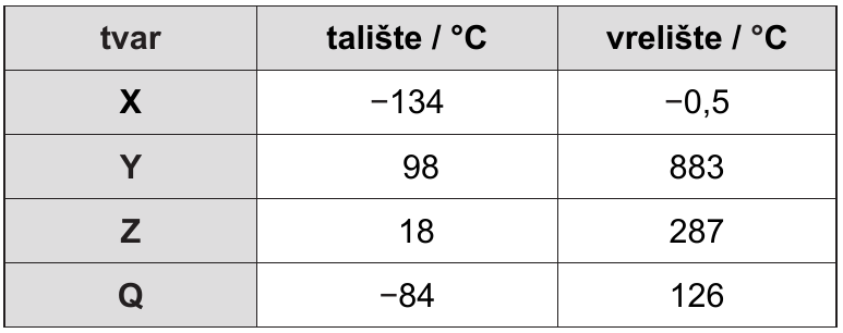 U tablici su navedena tališta i vrelišta tvari označenih slovima $\mathbf{X}, \mathbf{Y}, \mathbf{Z}$ i $\mathbf{Q}$ pri $10^{5} \mathrm{~Pa}$.