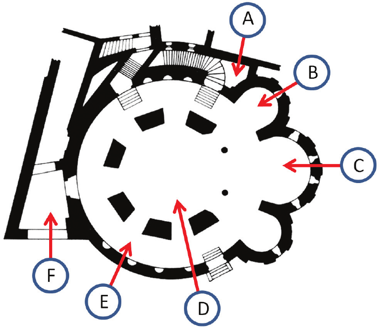 Nazivima elemenata pridružite neka od slova (od A do F) kojima su ti elementi označeni na slici.