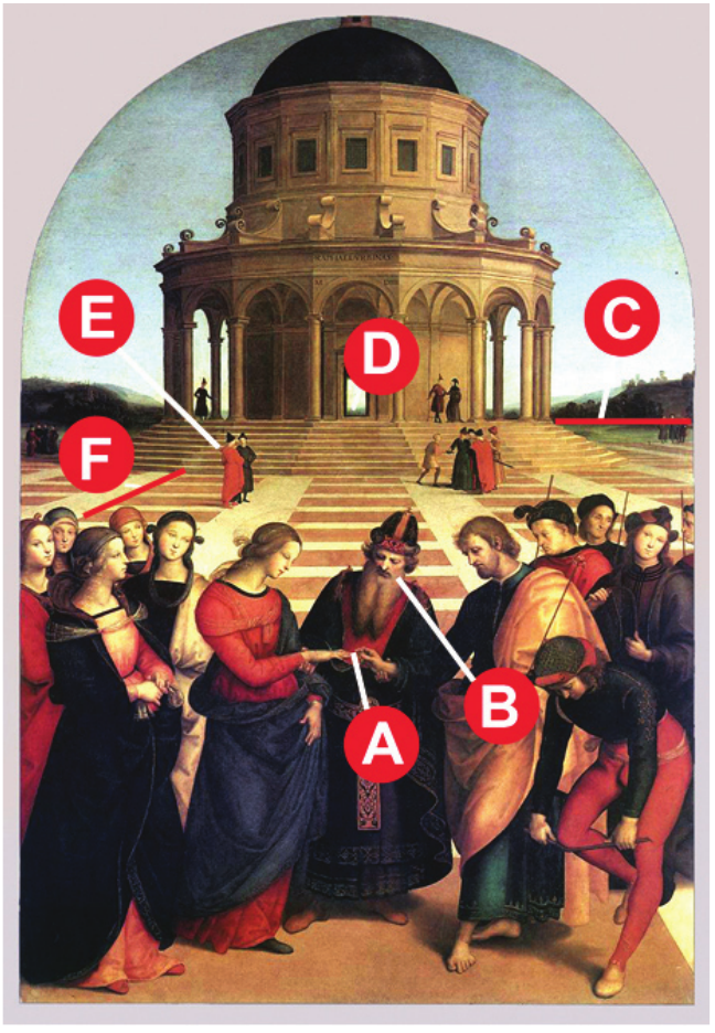 Pozorno promotrite likovni primjer i elementima prikazanoga djela pridružite neka od slova (od A do F) kojima su ti elementi označeni.