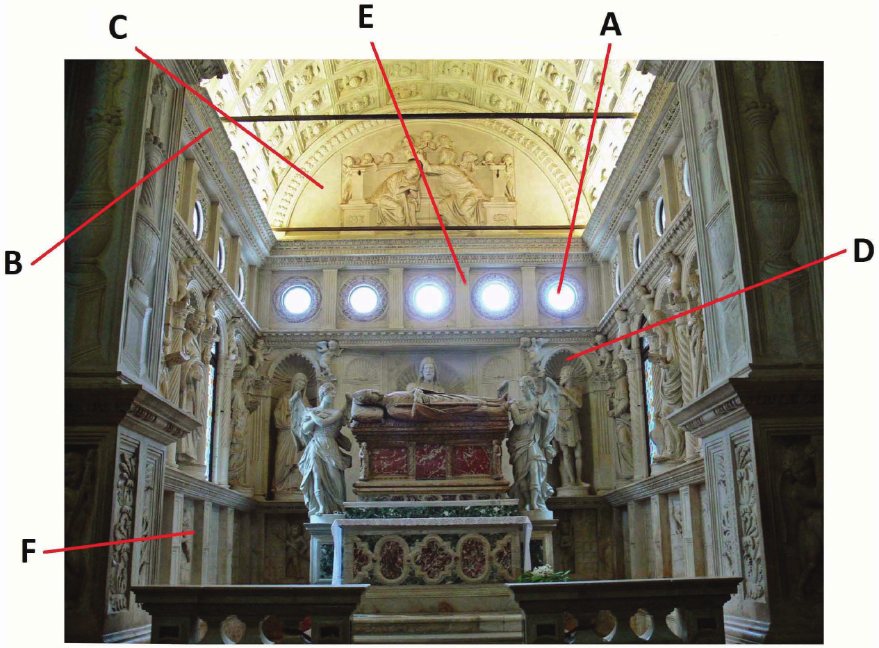 Pozorno promotrite unurašnjost građevine i svaki arhitektonski element povežite s jednim slovom (od A do F) kojim je taj element označen.
