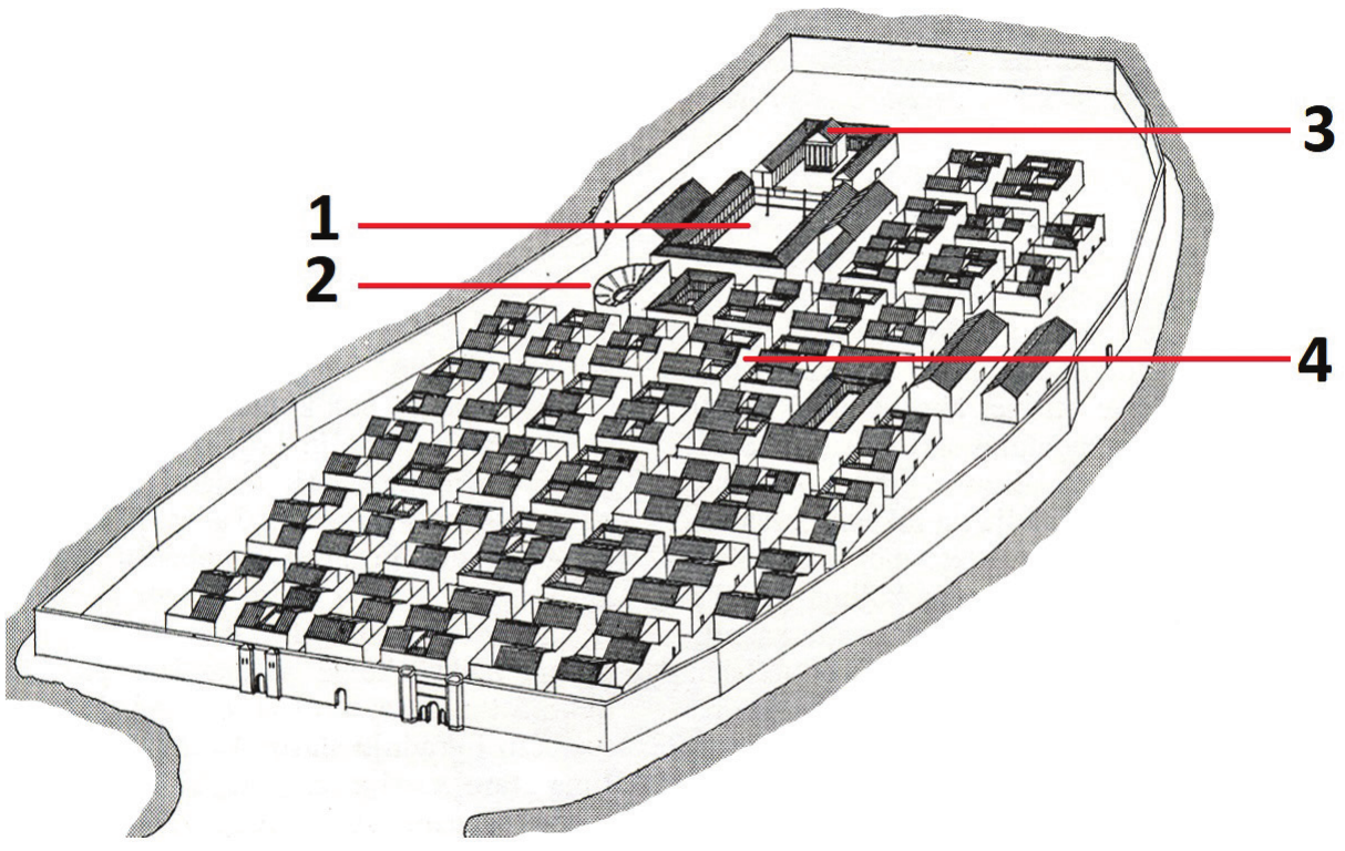 Pozorno promotrite aksonometrijski prikaz grada i svaki njegov dio označen brojevima od 1 do 4 povežite s odgovarajućim nazivom.