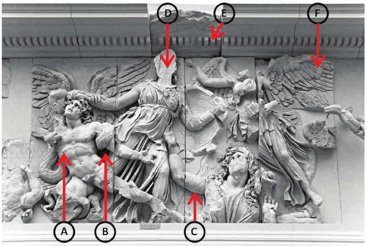 Nazivima likovnih elemenata pridružite neka od slova (od A do F) kojima su ti elementi označeni na slici.