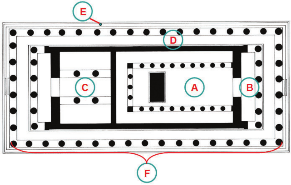 Pozorno promotrite likovni primjer i svaki naziv dijela tlocrta povežite s jednim slovom (od A\mathbf{A} do F\mathbf{F} ) kojim je taj dio označen.