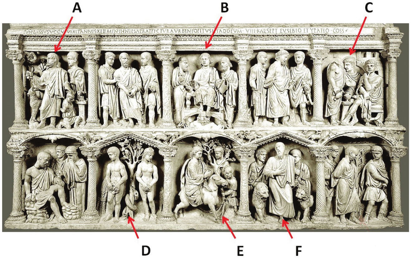 Pozorno promotrite likovni primjer i svaki naziv teme povežite s jednim slovom (od A\mathbf{A} do F\mathbf{F} ) kojim je ta tema označena.