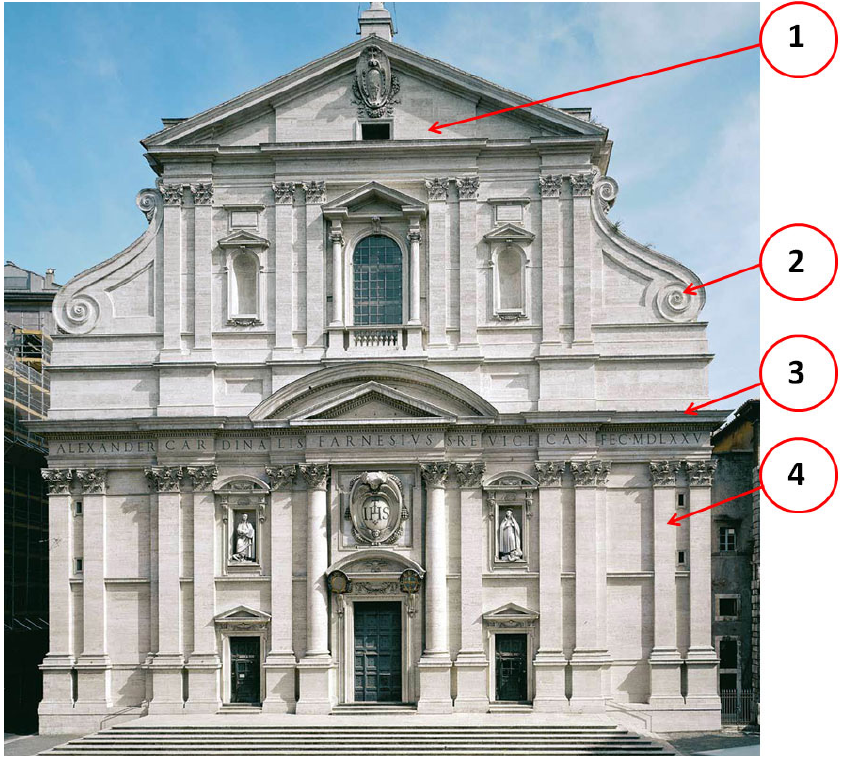 Pozorno promotrite prikazanu građevinu i svaki dio pročelja označen brojevima od 1 do 4 povežite s odgovarajućim elementom.