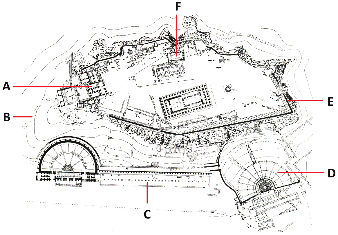 Pozorno promotrite prikazani tlocrt urbane cjeline i svaki navedeni dio tlocrta povežite s jednim slovom (od A do F) kojim je taj dio označen.
