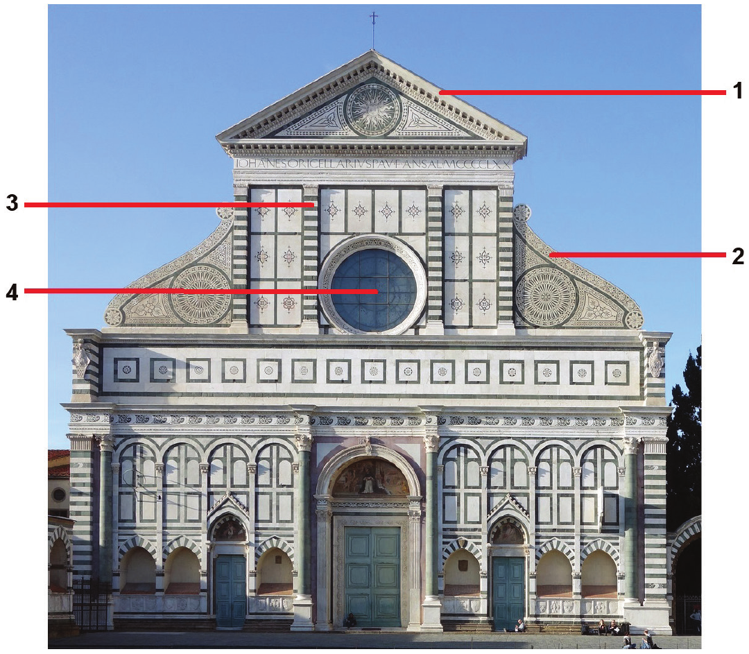 Pozorno promotrite prikazanu građevinu i svaki arhitektonski element označen brojevima od 1 do 4 povežite s odgovarajućim nazivom.