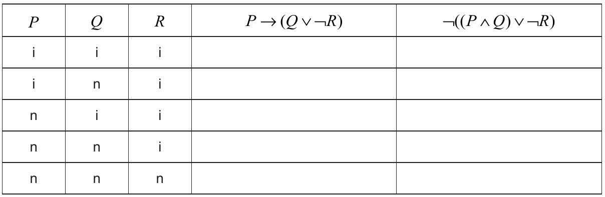 Popunite tablice istinitosti. U prostor predviđen za upisivanje upišite samo konačnu vrijednost istinitosti rečenica za svako traženo tumačenje jednostavnih sudova.