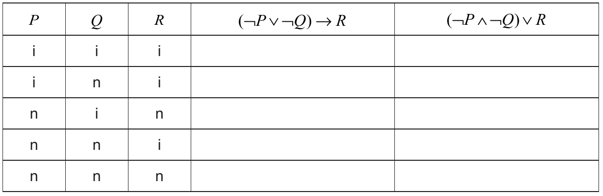Popunite tablice istinitosti. Upišite samo konačnu vrijednost istinitosti rečenica za svako traženo tumačenje jednostavnih sudova.