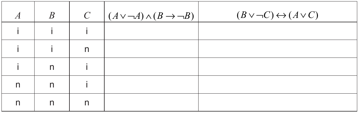 Popunite tablice istinitosti. U prostor predviđen za upisivanje upišite samo konačnu vrijednost istinitosti rečenica za svako traženo tumačenje jednostavnih sudova.