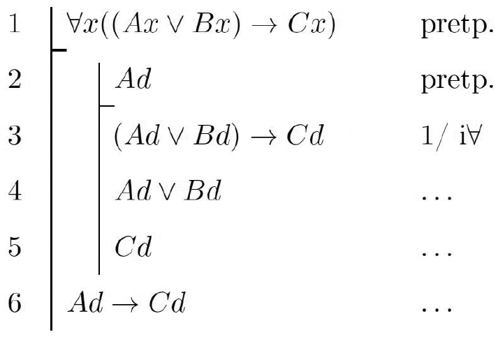 3 | $(A d \vee B d) \rightarrow C d$ | $1 / \mathrm{i} \forall$ |
